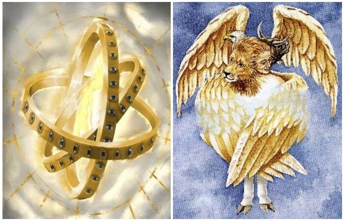 Херувимы, которых зачастую изображают как пухлых и безобидных младенцев, вызывающих умиление. Согласно писанию, Бог поручил херувимам множество задач. Одной из самых важных была охрана Эдемского сада. И если верить видению Иезекииля, то у каждого херувима помимо человеческого лица было ещё три других: льва, вола и орла. Ко всему прочему, у них было по две пары крыльев. Одна из них предназначалась для полёта, другая – для сокрытия их тел. По мнению еврейского учёного Маймонида, жившего в двенадцатом веке, у херувимов были ровные ноги и блестящие бычьи копыта.