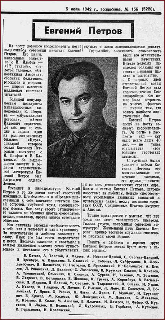... После кончины Ильфа смерть в буквальном смысле ходила за Петровым по пятам. Во время финской снаряд попал в угол дома, в котором публицист ночевал. Под Москвой в 41-м Евгений попал под минометный огонь немцев и едва уцелел. А в 42-м самолет, в котором военный корреспондент Петров возвращался из Севастополя, потерпел аварию и упал. Выжили все, кто там был, кроме него...