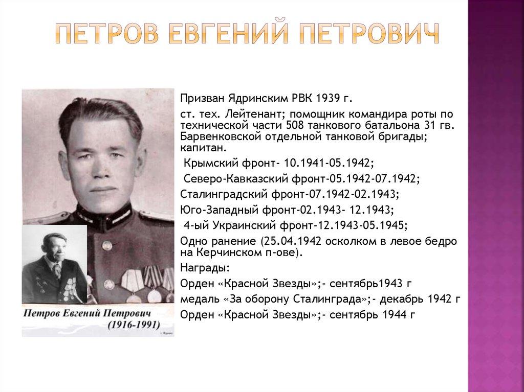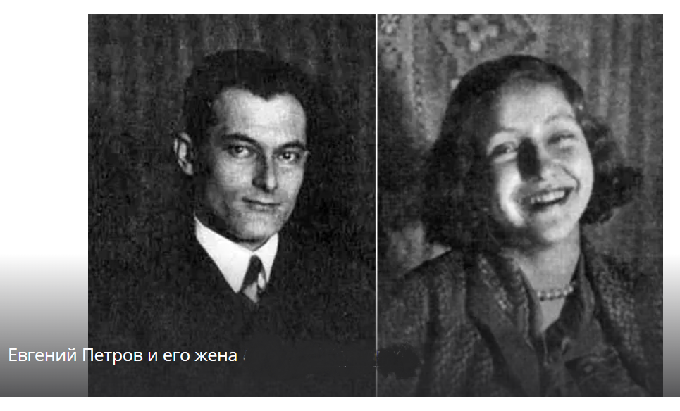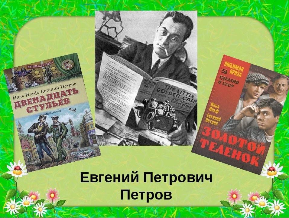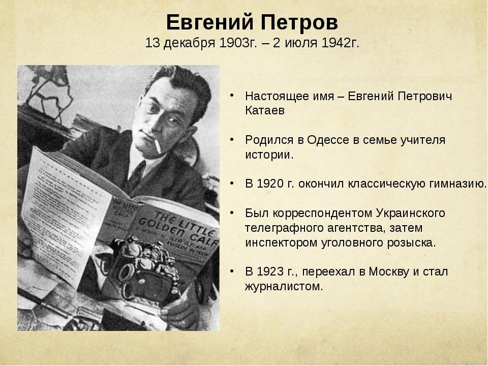 Петров (настоящая фамилия - Катаев) - родной брат известного писателя Валентина Катаева. Псевдоним взял из благородных побуждений, чтобы не заступать брату дорогу. В соавторстве с Ильфом написал известные романы "12 стульев" и "Золотой телёнок".