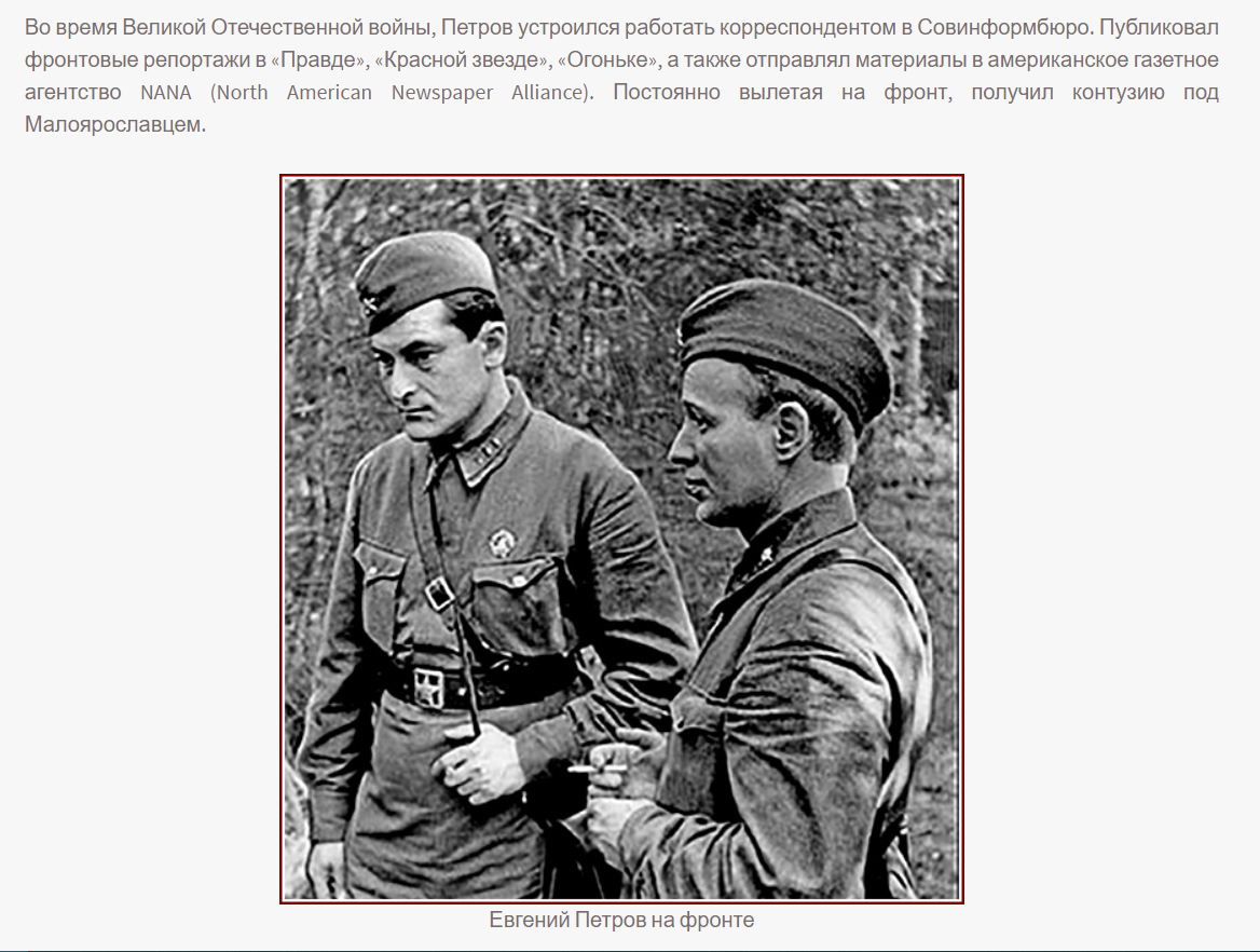 Евгений пережил друга на пять лет. Он был редактором «Огонька», написал несколько киносценариев, издал «Записные книжки» Ильфа и начал писать роман о нем. Не закончил – погиб на фронте.