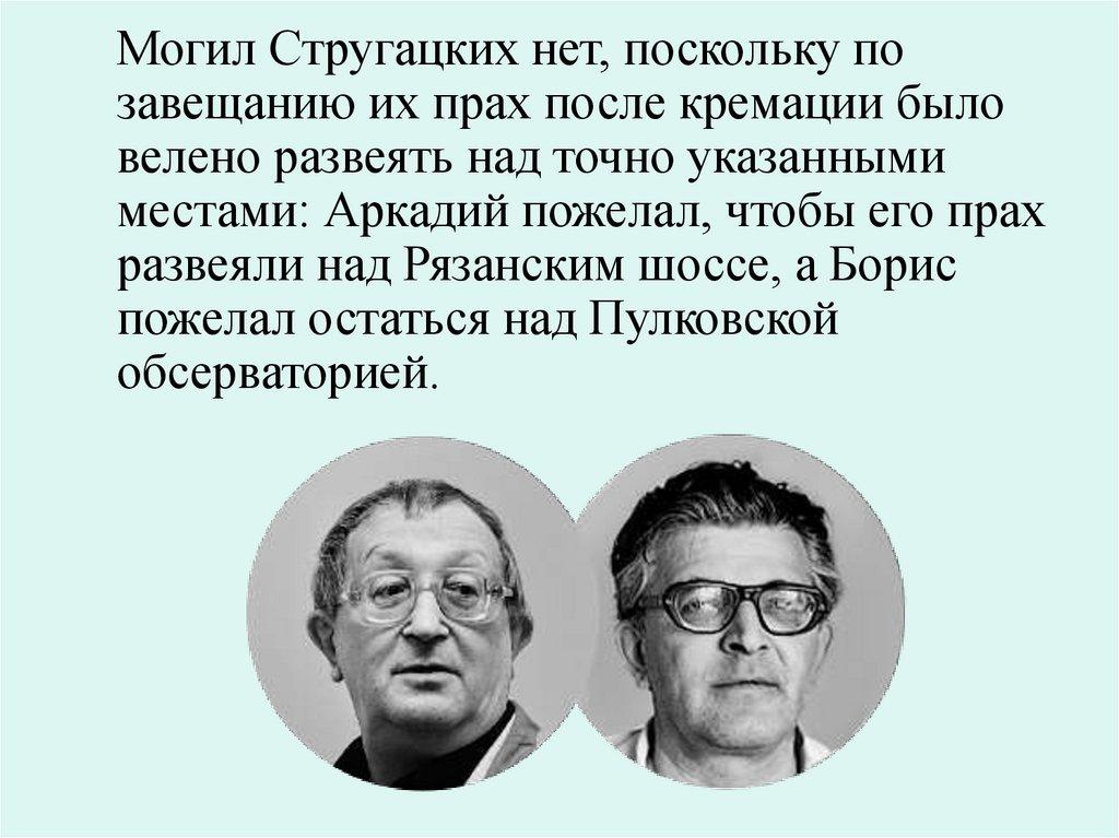 После того как старший брат умер в 1991 году, Борис Натанович, переживший его на 21 год, по собственным словам, «потерял половину себя» и продолжил «пилить толстое бревно литературы двуручной пилой, но без напарника».