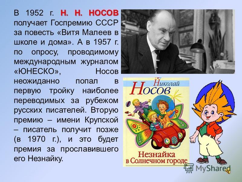 Проходит время, однако, персонажи, придуманные Николаем Носовым, не стареют. Да им это и не грозит – даже если и появятся новые, не менее талантливые авторы, пишущие для детей, герои Носова уже прошли проверку временем и на них выросло и вырастет еще не одно поколение. Потому что более искренней, честной и наполненной любовью к детям литературы в России (да и, пожалуй, во всем мире) найти очень трудно.