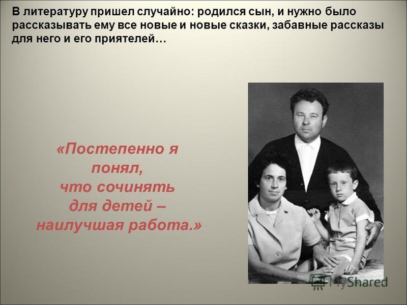 ... Постепенно я понял, что сочинять для детей – наилучшее занятие. Оно требует не только литературных знаний, но и знания психологии детей, а главное – любви к ним… Я понял, когда у меня рос сын, что к детям нужно относиться с самым большим и теплым уважением»