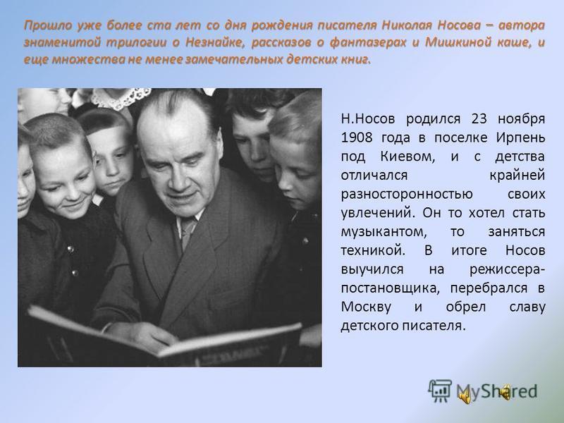 ... Создается ощущение, что, начиная сочинять истории о Незнайке, автор и сам не подозревал, во что разовьются коротенькие остроумные рассказы про недалекого и любопытного малыша, пытающегося «с налету» освоить самые разнообразные профессии. Автор отмечал, что многие черты своего героя он списал, наблюдая за своим маленьким сыном – Петей. Но из-под личины Незнайки лукаво выглядывал и сам Николай Носов, любивший носить широкополые шляпы, всегда охочий до любых начинаний и склонный к фантазированию.
