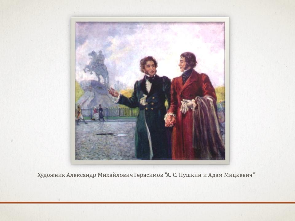 Хотя в друзьях поэта числились Рылеев, Бестужев, Жуковский, особое внимание историки всегда уделяют его дружбе с Пушкиным. Поэты переводили стихотворения друг друга, посвящали строки и могли бесконечно долго общаться. Современники писали, что после роковой дуэли Пушкина, Мицкевич даже искал Дантеса в Европе, чтобы отомстить.