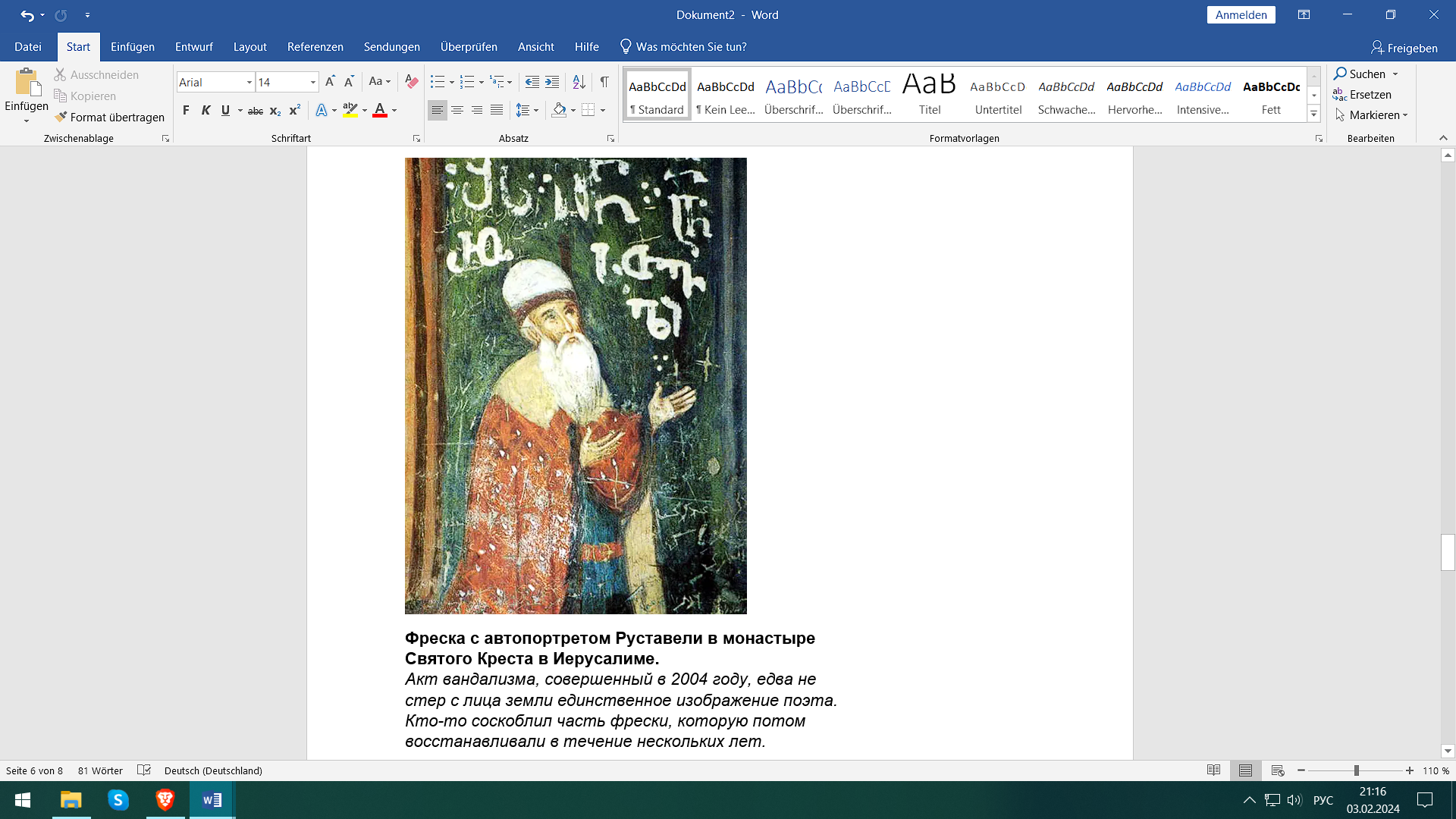 Даже поэт, который жил в мире грез и иллюзий, должен был признать: мечтать о царице ему больше не надо. И он уехал в Палестину, постригся в монахи в монастыре Святого Креста. Участвовал в его реставрации и собственноручно расписал колонны храма. Известно, что на одной из фресок он оставил автопортрет — единственное изображение, по которому можно судить о внешности грузинского поэта.