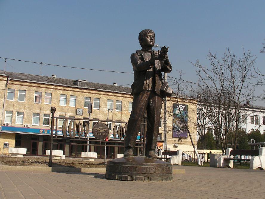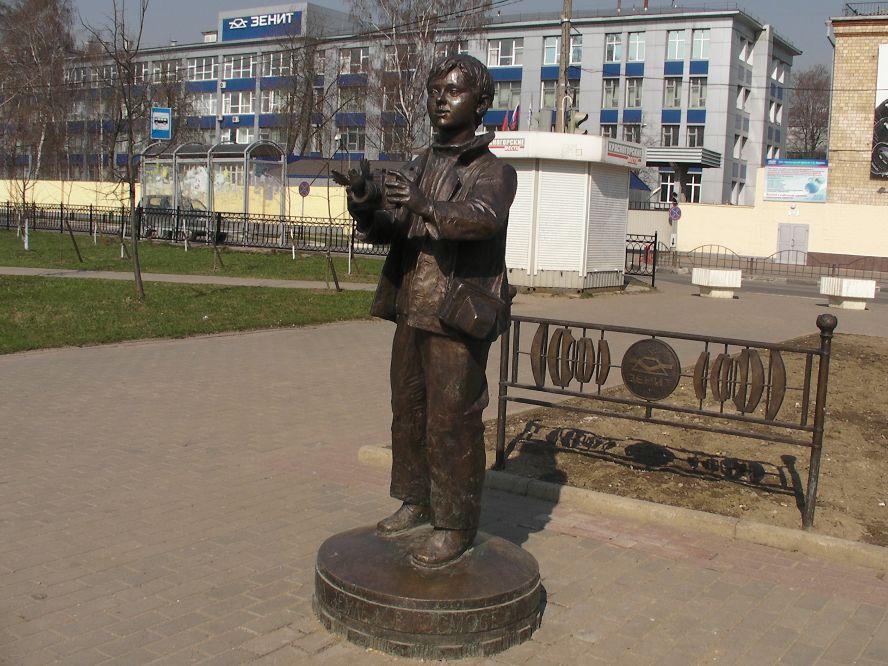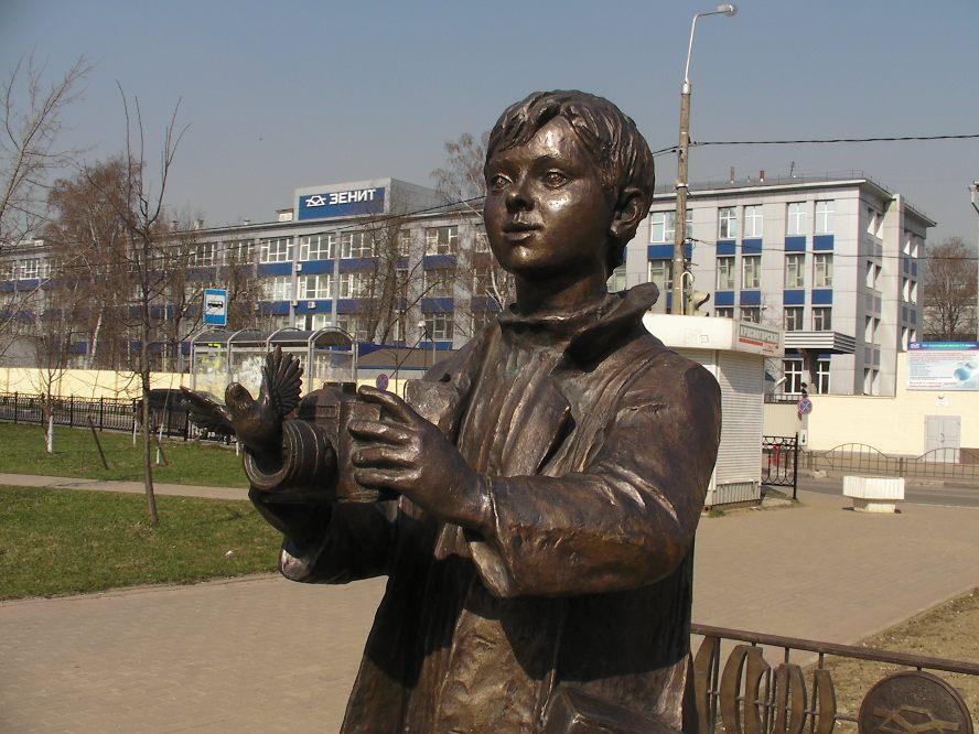Памятник мальчику-фотографу возле завода "Зенит" в Красногорске (Московская область). Птичка уже вылетела. Спасибо автору за кроссворд.