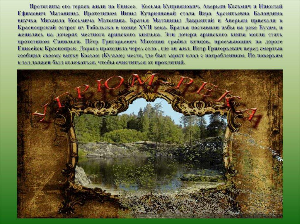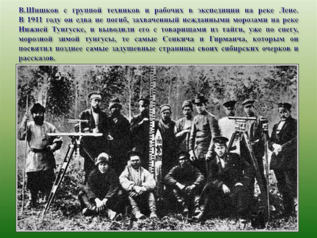 В 1911 году он едва не погиб, захваченный нежданными морозами на реке Нижней Тунгуске, и выводили его с товарищами из тайги, уже по снегу, морозной зимой тунгусы, те самые Сенкича и Гирманча, которым он посвятил позднее самые задушевные страницы своих сибирских очерков и рассказов. Пережитое самим писателем помогло ему так выразительно рассказать о едва не погибшем в подобных обстоятельствах Прохоре Громове, герое знаменитого романа «Угрюм-река».