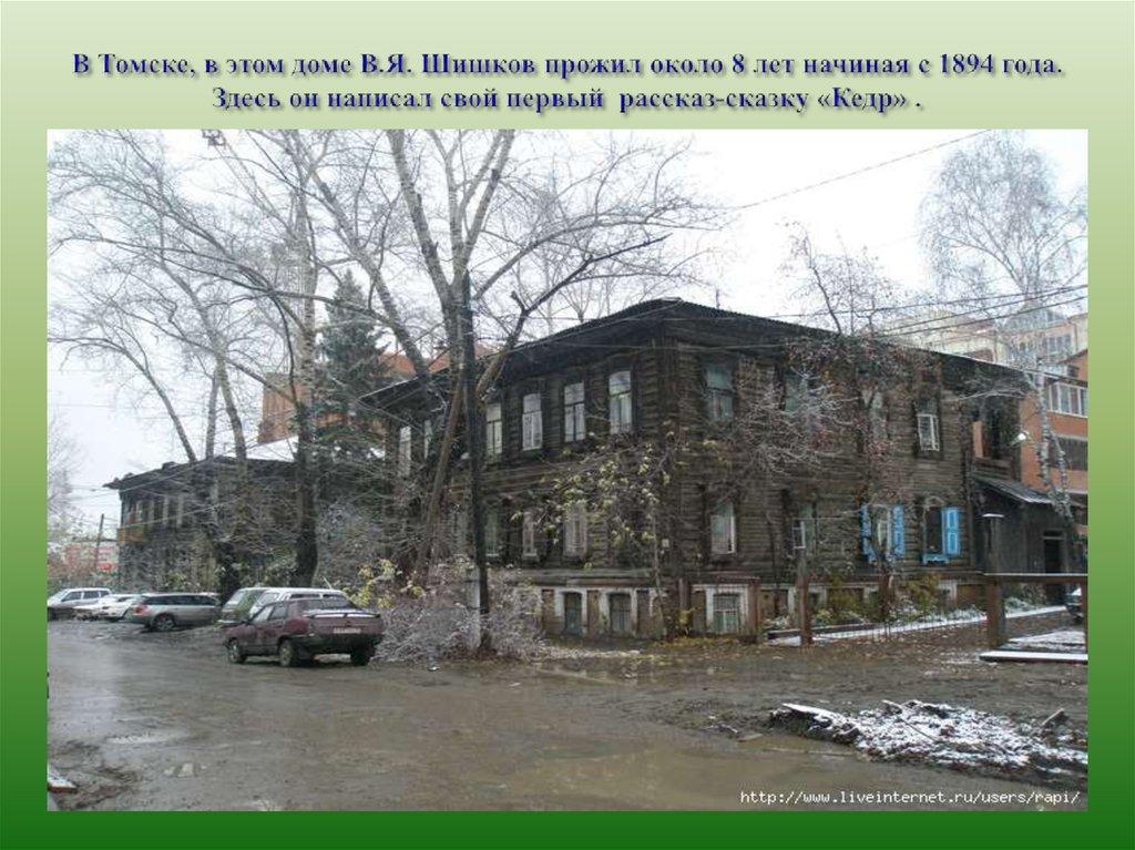 Отмечался двадцатипятилетний юбилей педагогической деятельности доброго знакомого П. Вяткина, которому Шишков и посвятил сказку «Кедр», предложив её томской газете «Сибирская жизнь». Газета опубликовала эту сказку. «Мне было 35 лет, – вспоминает Шишков, – но, когда появилась в печати моя вещичка, я радовался, как ребёнок».