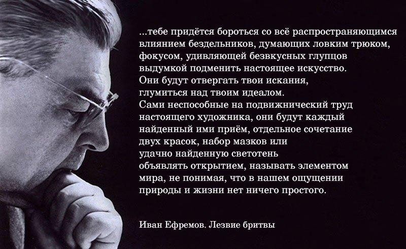 «Ефремов, едва ли не самый живописный персонаж в истории русской словесности, обладал способностями, которые в таком букете и такой степени будут встречаться, пожалуй, разве что в эпоху Великого Кольца. Силач, боксёр, рослый красавец, человек с фотографической памятью, знавший наизусть всего Брюсова и Блока, страницами цитировавший Грина и Дойла, основатель новой отрасли палеонтологии (именно за свою “Тафономию” он получил Госпремию), геолог, зоолог, путешественник, философ, историк, обладатель глубокого баса и абсолютного слуха... После “Туманности”, прославившей его во всём мире и повлиявшей на юного Джорджа Лукаса до того, что в честь Дара Ветра он назвал Дарта Вейдера, Ефремов написал, вероятно, самое странное своё сочинение, глубоко и многослойно зашифрованный роман “Лезвие бритвы”».