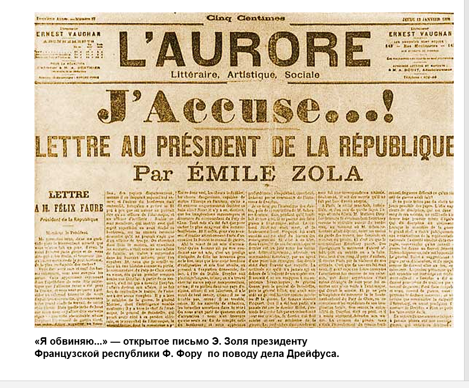 Газета L’Aurore публикует обличительное письмо Золя к президенту республики, известное под названием «Я обвиняю». Писатель открыто и эмоционально уверяет, что дело сфабриковано и Дрейфус невиновен. Эта публикация имела эффект разорвавшейся бомбы: теперь обвинения и угрозы сыпятся уже в адрес писателя, «защитника шпионов».