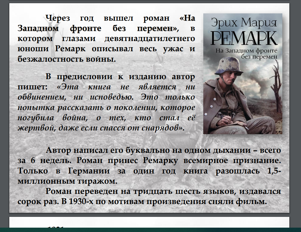 Этим человеком стал Эрих Мария Ремарк. Побывав на фронте, он показал миру настоящее лицо войны, а не маску, в которой она появляется на обложках пропагандистских газет. В романе «На Западном фронте без перемен» Ремарк показал, как искажается личность под давлением военной машины, показал, что в войне нет и не может быть победителей...