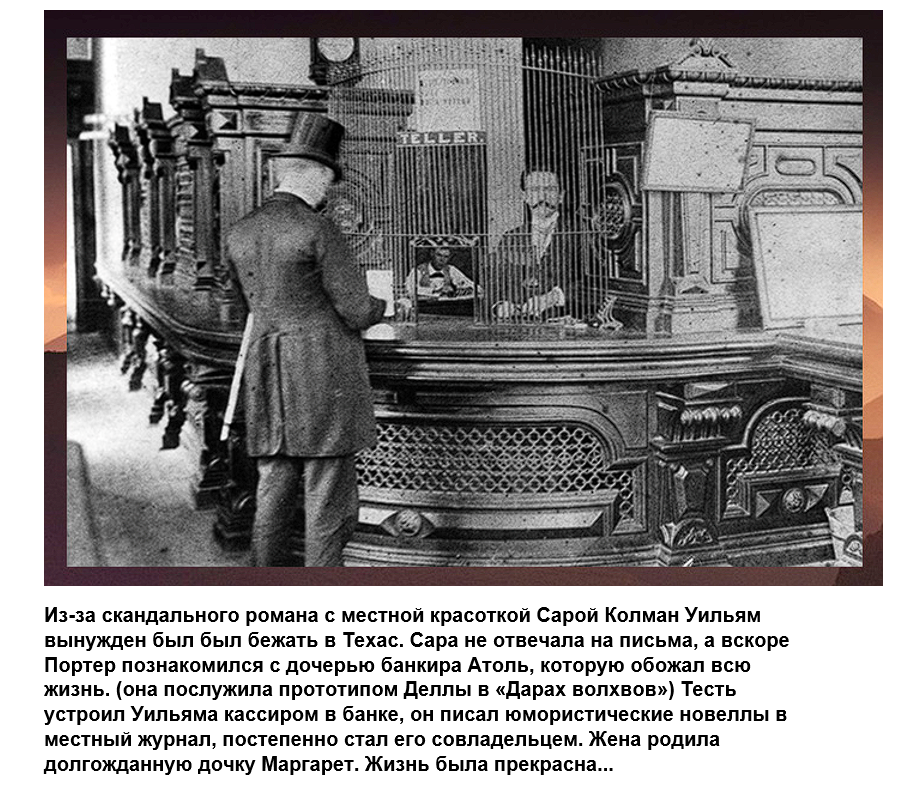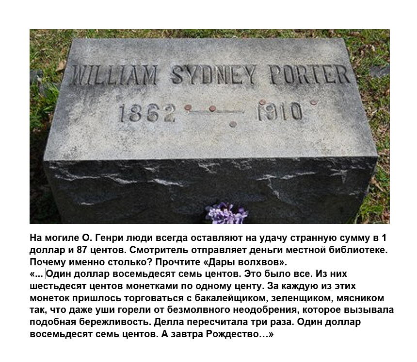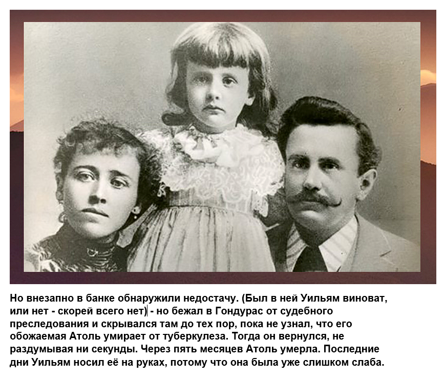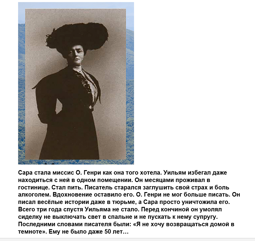 Остроумный расказчик, играл на гитаре и мандолине, пел серенады женщинам, осужден за растрату в банке, где работал, бежал в Гондурас, где написал "Королей и капусту" и придумал термин "банановая республика". По возвращении в США пришлось-таки отсидеть в тюрьме. Страдал туберкулезом, как его мать и жена. В конце жизни много пил и умер от цирроза печени. Его рассказам и новеллам свойственны тонкий юмор и неожиданные развязки. По эмоциональному воздействию они производят неизгладимое впечатление. Мои любимые "Дары волхвов" и "Последний лист".