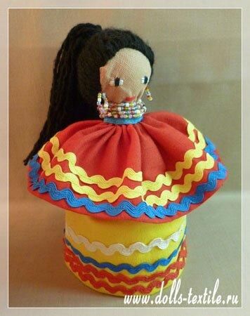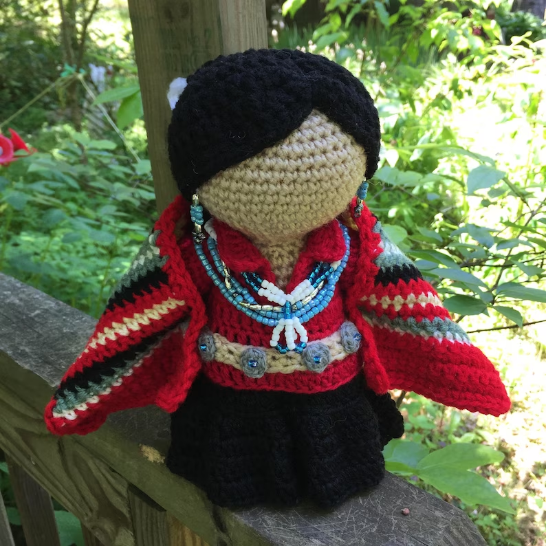 Чёрная ткань на голове изображает высокую традиционную причёску у женщин семинолов. Сейчас для туристов стали делать кукол и с косичками или хвостиками.