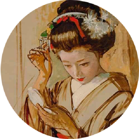 И "Луне подобна нежная красота юной гейши", и кимоно, и прическа - все аутентично, и "задник" выдержан в японском духе.