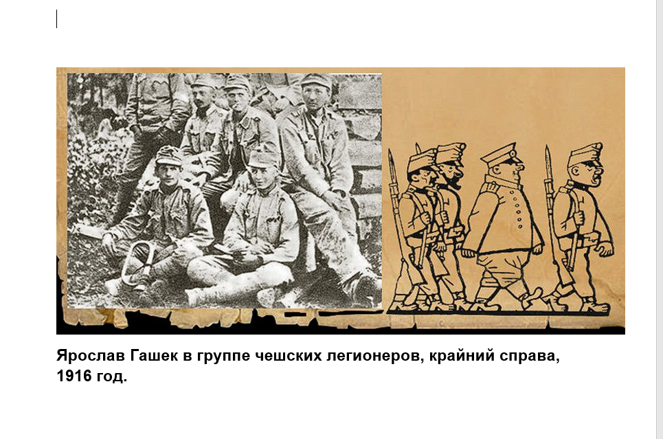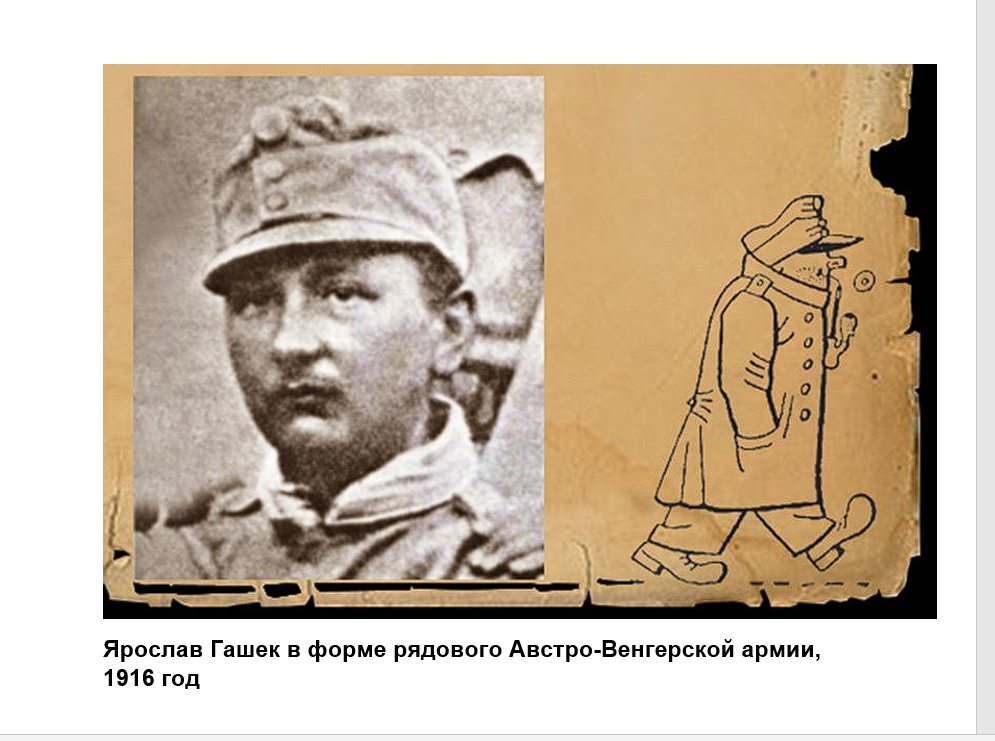 Ярослава Гашека, весельчака, анархиста, комиссара-красноармейца и писателя призвали в Австро-Венгерскую армию в 1915 году в возрасте 32 лет, он был зачислен в 91-й пехотный полк, расположенный в Ческе-Будеёвицах.