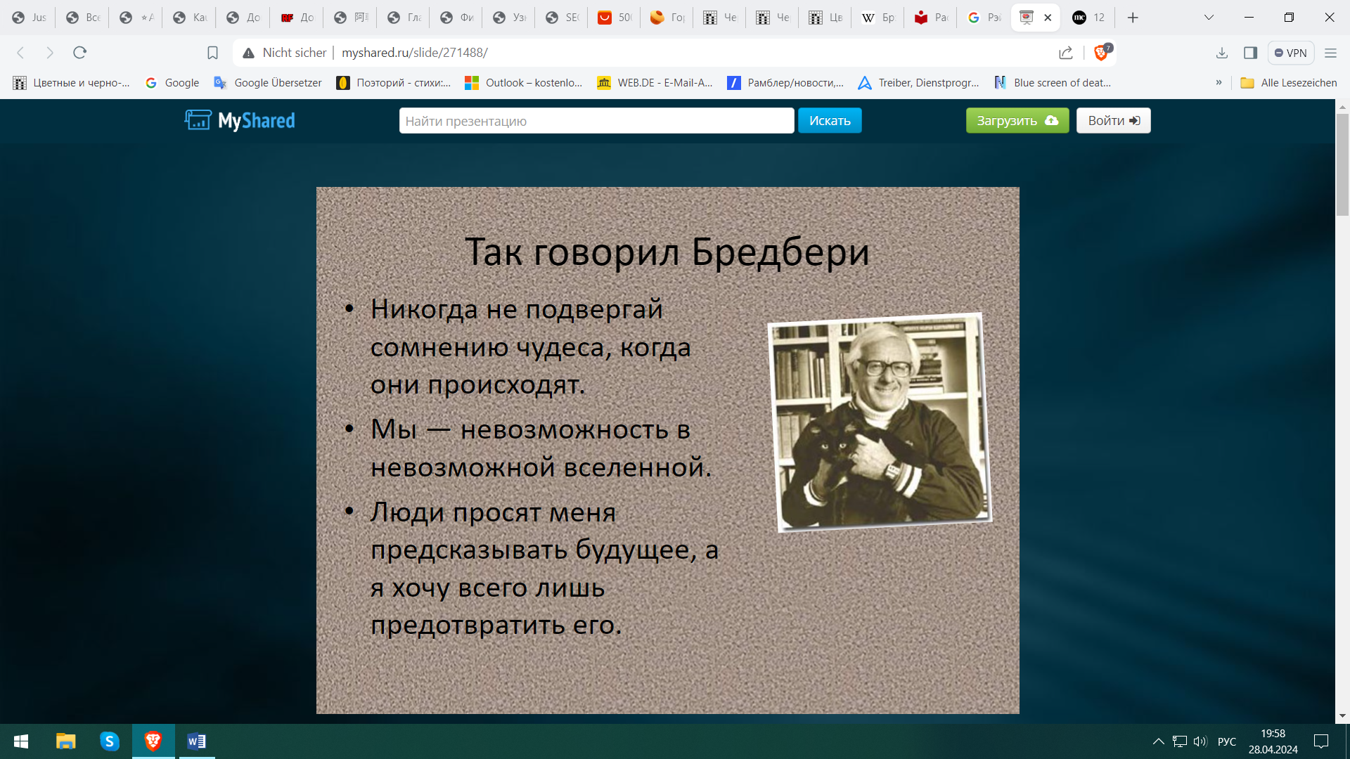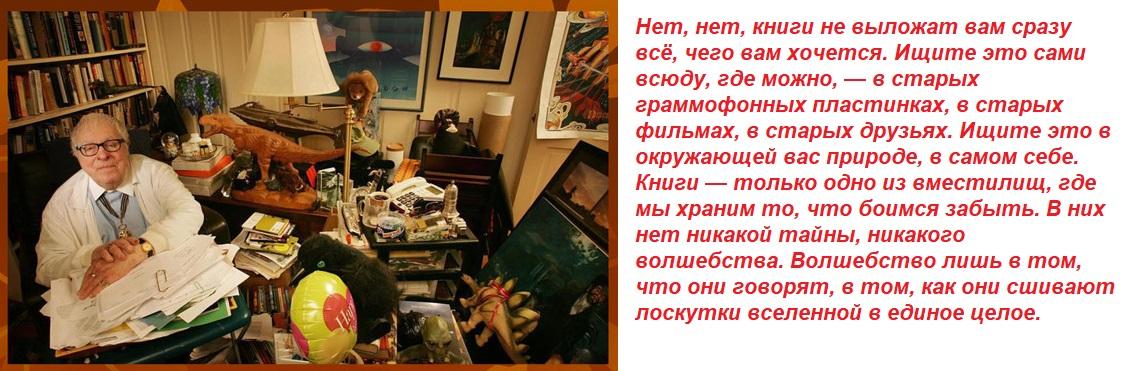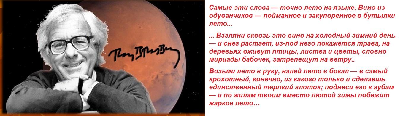 ответитьСпасибо автору за отличный портрет, а писателю - за его произведения, наполненные чудесной любовью к жизни, добротой, заботой и тревогой за будущее. От моего поколения, которое росло на "Марсианских хрониках, "Вине из одуванчиков" и "451 по Фаренгейту"