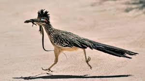 Так называют калифорнийскую земляную кукушку. Бегает быстро - около 32- 42 км/час, Хоть и кукушка, но свои яйца в чужие гнезда не подкладыает, высиживает свое потомство сама. Большую часть времени проводит на земле, поедая все, что встречается на пути, включая молодых гремучих змей и скорпионов. А помство выкармливает исключительно пресмыкающимися. Вот такая интересная пичка)