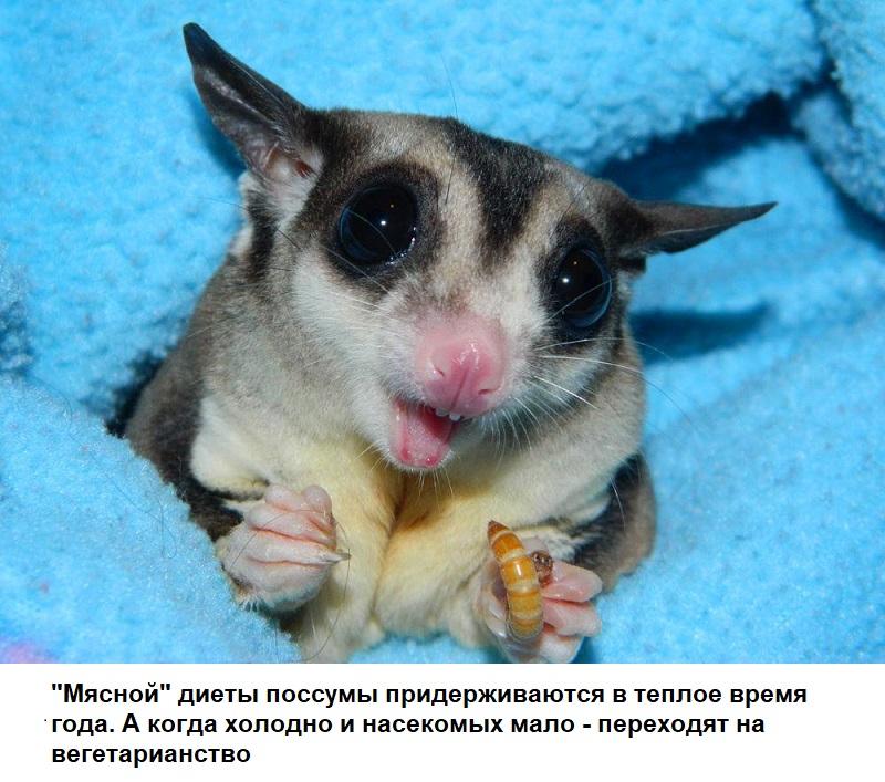 По сезону в рационе ССЛ - насекомые, птичьи яйца мелкие рептилии и грызуны. А также сок эвкалиптов и акаций, нектар и фрукты. (За любовь к этой сладкой пище зверек и получил прозвище «сахарный»