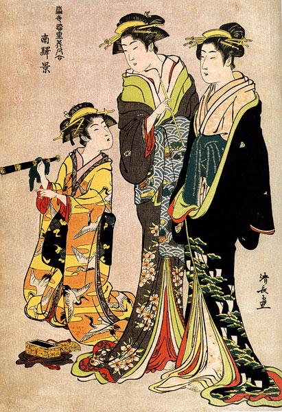 ...Эту прекрасную историю Тории Киенага услышал в Минами, располагавшемся в южной части Эдо. Рассказ о первой и чистой любви вдохновила молодого и малоизвестного художника. Он написал картину, назвав ее "В квартале Минами", и вскоре эта работа прославила мастера.
