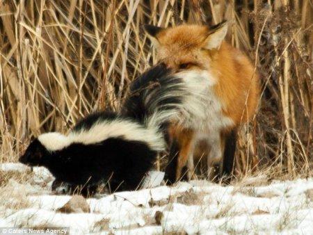 По-моему, малыш в панике. А пугать скунса, даже такого маленького и хорошенького, очень, ОЧЕНЬ не рекомендуется!)))