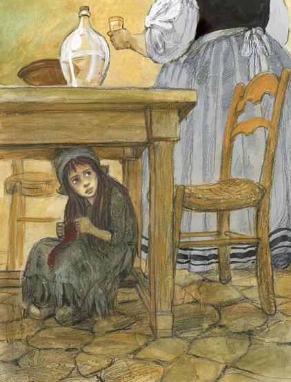 А в представленной вами иллюстрации Козетта под столом или рядом со столом?))
