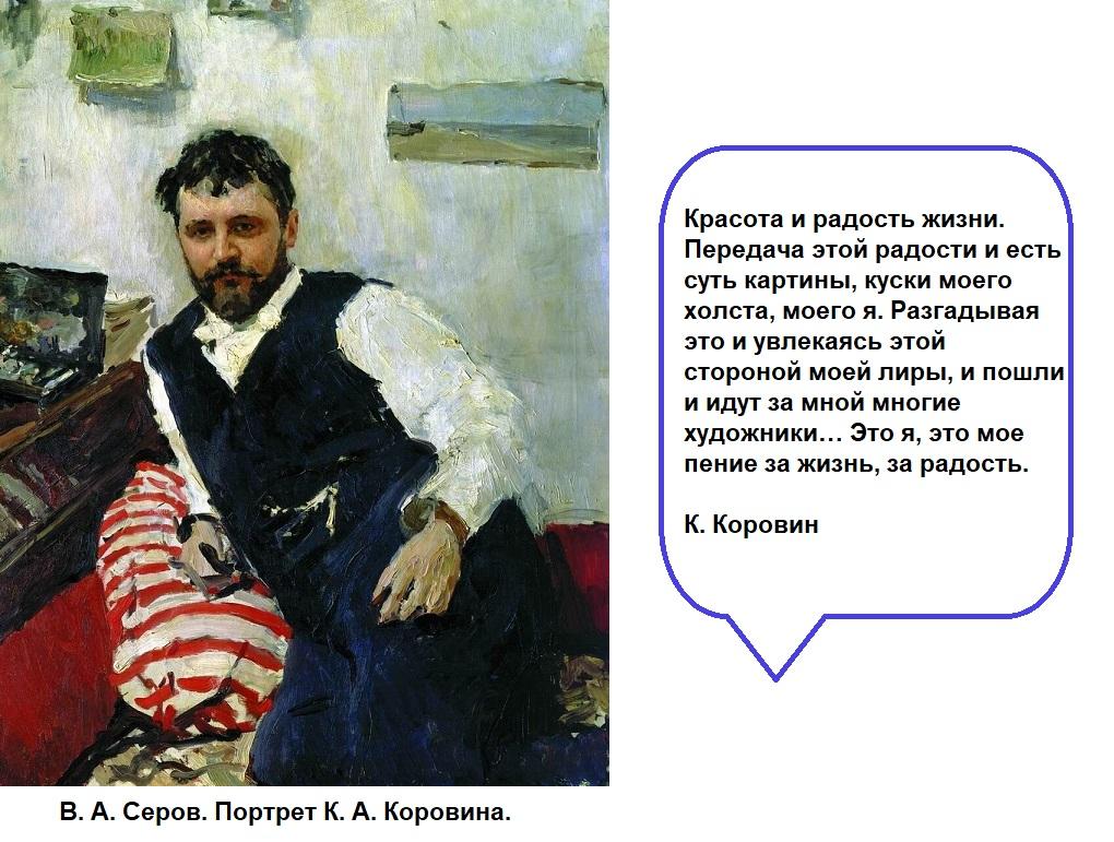 "Земное окружение, леса, цветы, реки наши и озера, одним словом - природа, созерцание ее - было самым существенным в моем детстве, и осталось самым дорогим и родным сердцу на всю жизнь. Природа захватывала всего меня, с головой, с сердцем и душою, давала настроение, как если бы ее изменения были слиты с моей душой. Солнечные голубые дни, золотые осени, яркие вёсны и зимние снега, грозы, мрачная непогода, сумрак, бурные или лунные ночи - все в равной степени пленяло и впечатляло меня... Это было для моей жизни и чувств самое главное."Автор убил сразу двух зайцев))) Это одновременно и удачная интерпретация портрета первого русского импрессиониста, и работа одного из предыдущих персонажей автора - В. Серова.