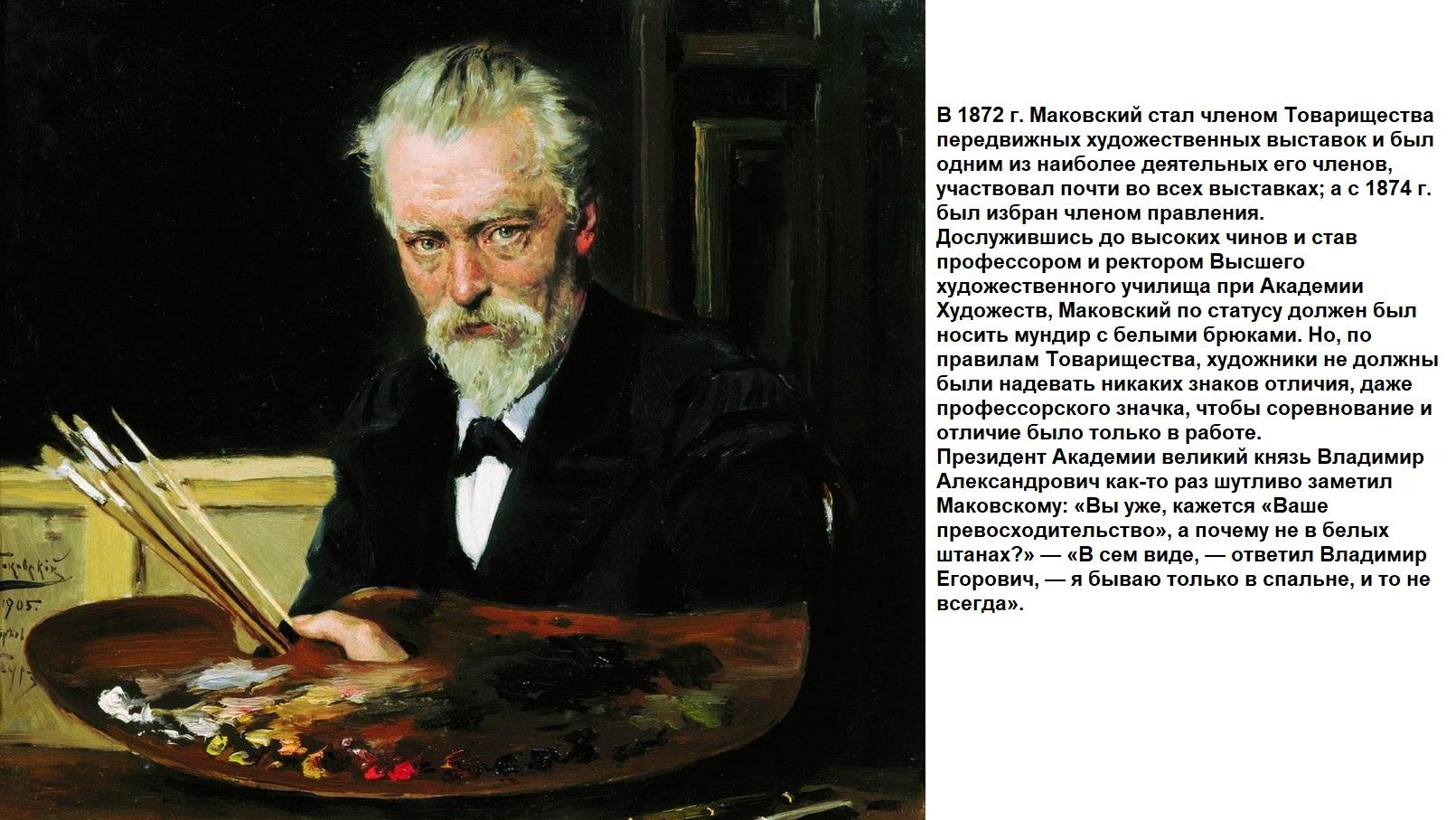 Творческое наследие Владимира Маковского насчитывает более пятисот картин... Обладая редкой наблюдательностью, прекрасно изучив человеческие нравы и характеры, он с оставил нам настоящую панораму русской жизни XIX века, изобразив ее с поразительной точностью и добротой.