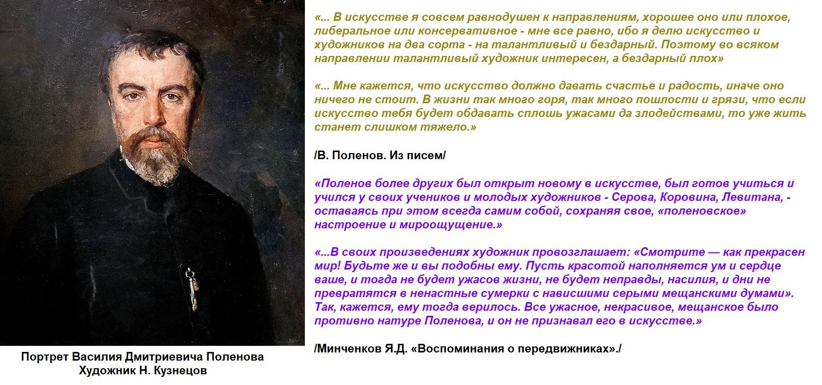 "Очень скоро покупатели красок в московских лавках станут наивно требовать: «Дайте нам краски, как на картинах художника Поленова! Такие, знаете, яркие, солнечные, пусть даже они будут стоить дороже!»И подумать только, что этому художнику некоторые современники говорили: