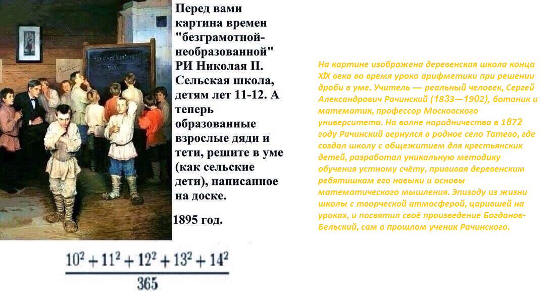 ответитьМне нравятся его симпатичные жанровые картины. А с одной из них нас познакомила еще в школе ... учительница математики. Она все своим классам предлагала решить задачу, написанную на доске в картине Богданова-Бельского "Устный счет". (С комментарием, что, дескать с этой задачей справлялись даже маленькие крестьянские мальчишки)))