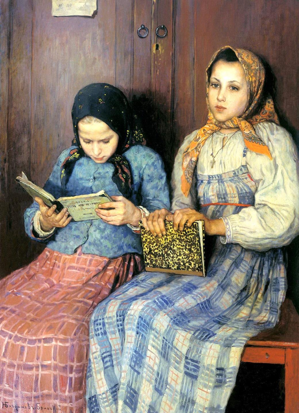 Мне нравятся его симпатичные жанровые картины. А с одной из них нас познакомила еще в школе ... учительница математики. Она все своим классам предлагала решить задачу, написанную на доске в картине Богданова-Бельского "Устный счет". (С комментарием, что, дескать с этой задачей справлялись даже маленькие крестьянские мальчишки)))