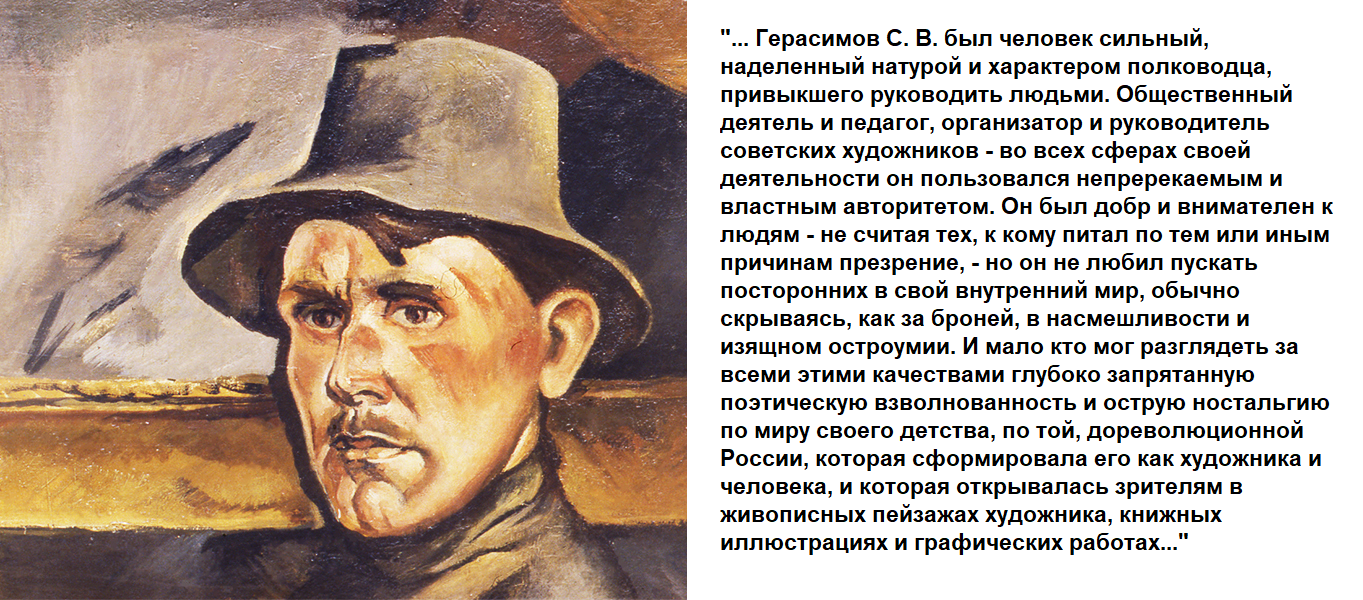 ответить«... Настроениями и чувствами, навеянными городом детства Можайском было рождено все лучшее в творчестве Герасимова - пейзажиста и иллюстратора, блестящего живописца, портретиста и рисовальщика...От своего учителя К. Коровина, а еще больше от французских импрессионистов он воспринял необходимость удержать, сохранить красоту живого изменчивого мира. Восклицание Фауста: "Остановись, мгновенье, ты прекрасно!" - Герасимов воплощал в своих пейзажах. ... Он никогда не писал пейзажей "вообще". В его пейзажах всегда есть точный адрес места и точное определение времени. ...Сила живого впечатления создавалась в его работах безукоризненной верностью попадания цвета, безупречной мягкостью мазка и чувством движения - у художника нет ни одного миллиметра застывшей, мертвой поверхности; краски живут, переливаются, мерцают...»Прекрасная, очень похожая интерпретация автопортрета художника.