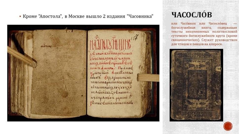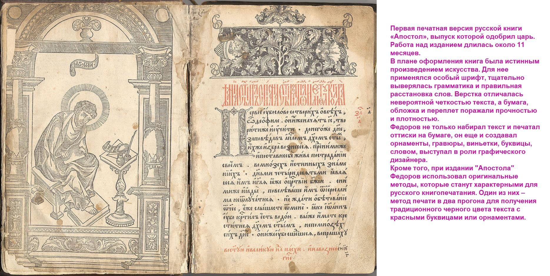 Первой его печатной книгой стал "Апостол", куда вошли библейские книги "Деяния святых апостолов, "Откровение Иоанна Богослова", а также послания Иоанна, Петра, Павла и Иакова.