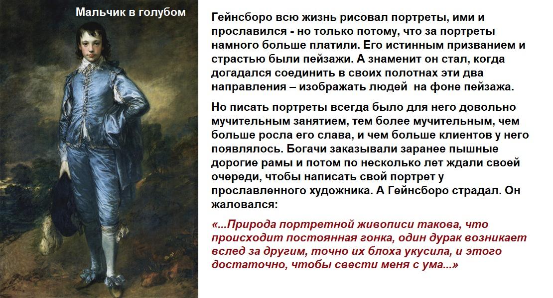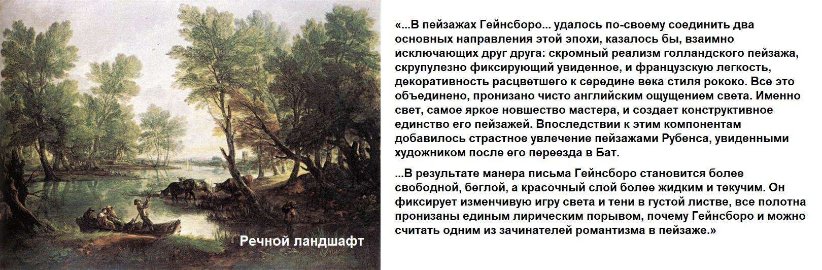 Возможно, именно благодаря этому и возникает ощущение непринужденности героев его картин. Этот эффект усиливается за счет смелого распределения световых пятен: игра света на картинах Гейнсборо создает ощущение мимолетного, ускользающего на наших глазах мгновения. Такой прием через два столетия будут активно использовать и развивать в своих работах художники-импрессионисты.