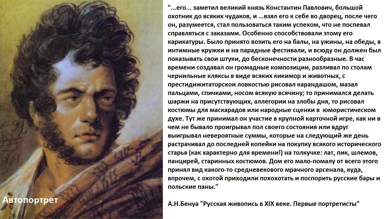 "Первый поэт войны и мира, поэт героического эпоса. Курьезный оригинал, о котором говорят все, но жизнь которого мало известна. Легендарная личность, герой невероятных похождений, забавный чудак, дикий самодур и изысканный коллекционер редкостей. Первый художник быта, насмешник-карикатурист, портретист, живописец животных, пейзажист, может быть скульптор. Поляк, ученик француза, проведший полжизни в России. Художник, солдат, странствующий актер, любимец Великого князя Константина. Атлет... "ленивый, преленивый" автор тысяч рисунков. Странная смесь способностей и недостатков, характерная фигура тревожной и мирной жизни Александровского времени. Его рисунки - целый дневник эпохи романтической и увлекательной".