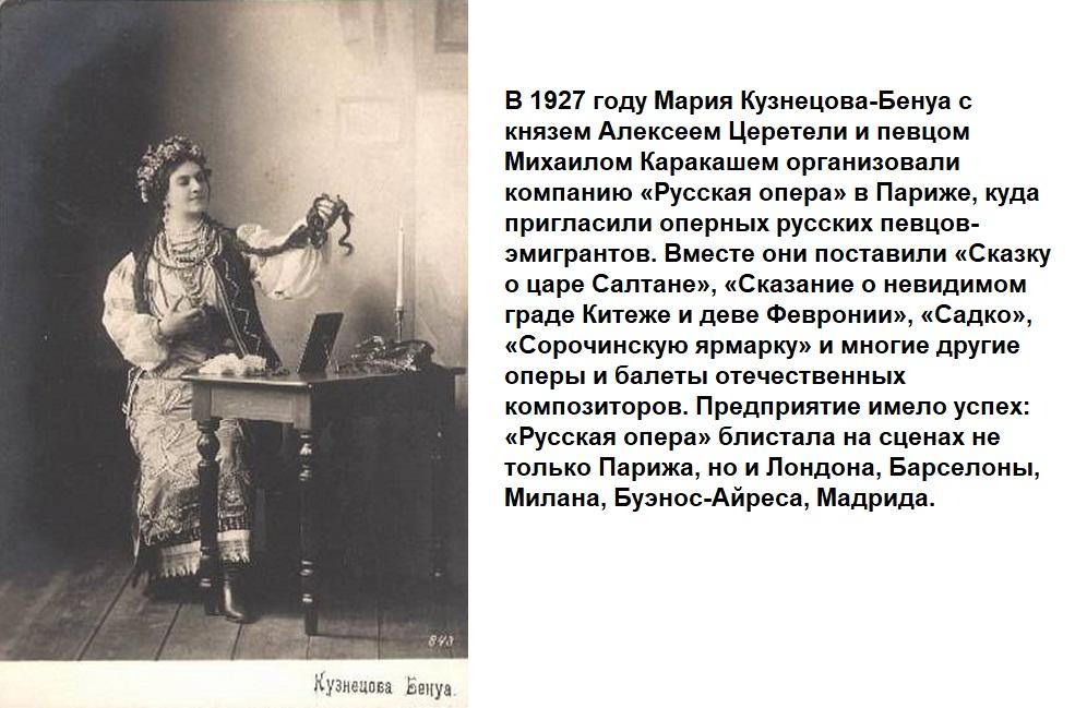 Кузнецова-Бенуа давала частные концерты, где исполняла французские, русские, испанские, цыганские песни, романсы и оперы, а также танцевала испанские народные танцы и фламенко в шикарных костюмах Льва Бакста. Она без особого труда стала востребованной звездой парижской оперы, а побывать в её салоне считалось за великую честь.