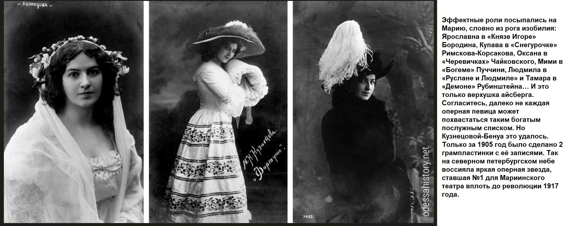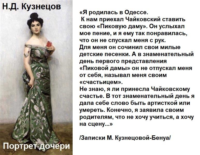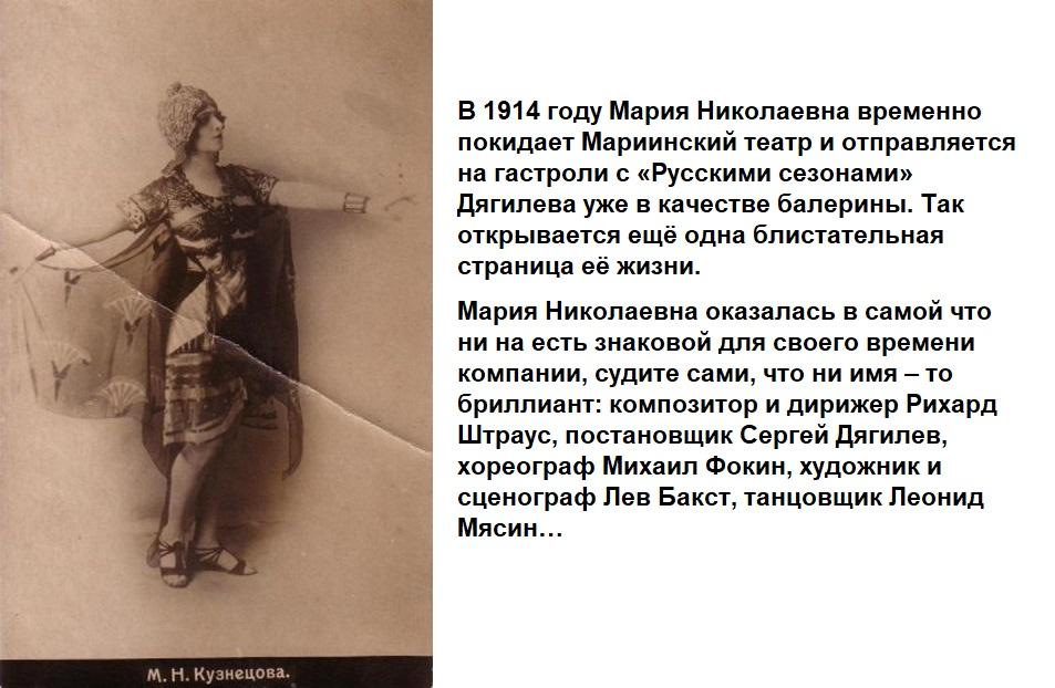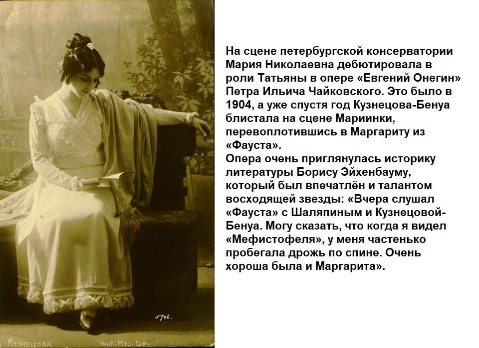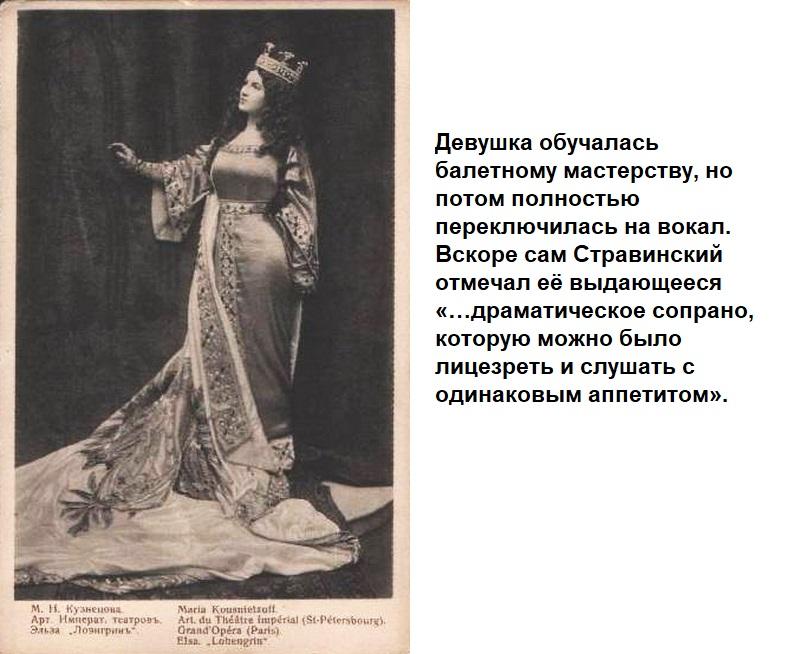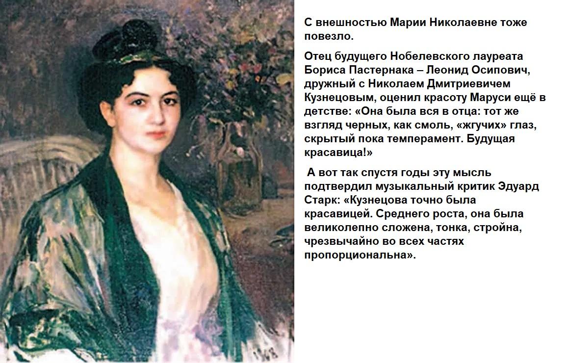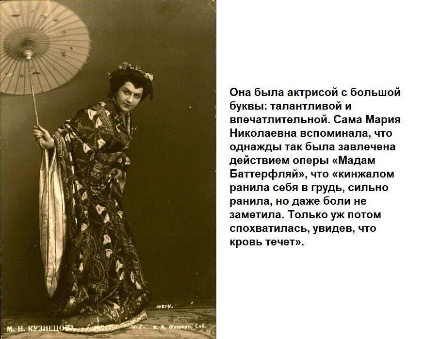 Дочь знаменитого живописца, участница легендарных «Русских сезонов» Дягилева, работавшая с Римским-Корсаковым, Рихардом Штраусом, Жюлем Массне, певшая с Федором Шаляпиным и «Орфеем российской сцены» — Леонидом Собиновым, она была символом эпохи. Причем с ее именем не связано было ни одного скандала, несмотря на то, что Мария Николаевна - прима, оперная певица, красавица и муза.