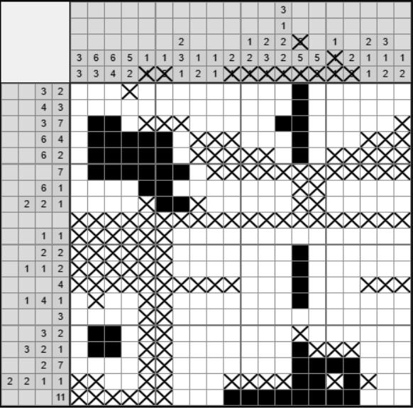 7 столбец и 7 строчка слева, их перекрестие, там надо просчитать, будет ли крестик или будет закрашена клетка. Если предположить наличие крестика, тогда при просчёте не сможет выполниться первая четвёрка во второй строчке слева. Значит, на перекрестии 7 столбца и 7 строчки слева будет закрашенная клетка (т.е. тройка из 7 столбца). После этого всё решается как по маслу.