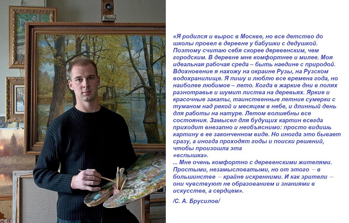 «Я жил в запахах краски отцовской мастерской, в окружении предметов искусства и книг о разных художниках. Одним из самых значительных факторов, повлиявших на мой выбор, были часы, когда я, сидя за спиной отца, смотрел как на чистом холсте под карандашом и кистью рождались образы людей и пейзажи родной природы. Для меня, ребёнка, это было как магия и самому хотелось повторить этот процесс. Сейчас по прошествии многих лет, я понимаю те вещи, что делал отец, но это чувство магии сохранилось со мной, с детства до сих пор...» /С. А. Брусилов/