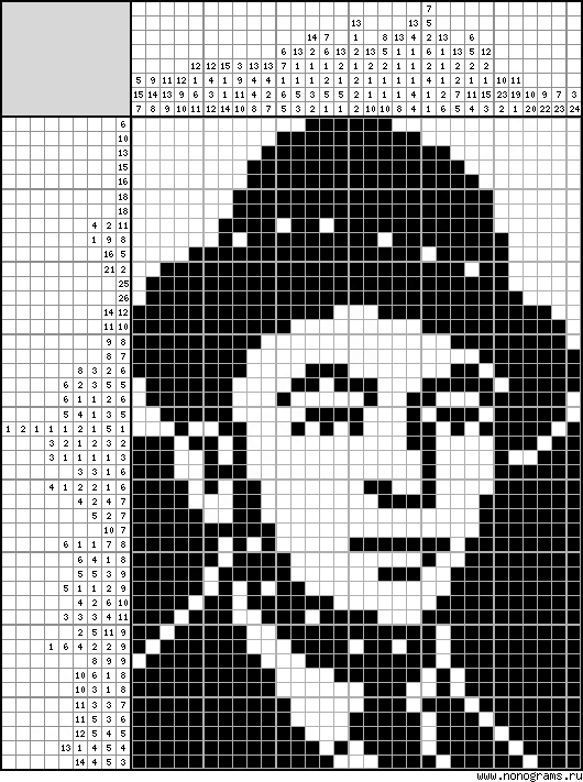 Мне нужно не просто перерисовать картинку, а сделать японский кроссворд. А там ограничение - размер не больше, чем 45х45 пикселей. Так что передать такие мелкие детали, как выражение глаз, к сожалению, навряд ли кому-нибудь удастся.