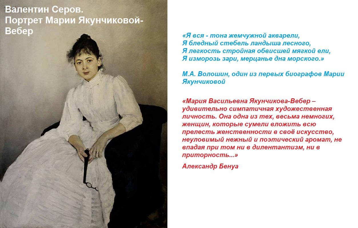 Мария Якунчикова-Вебер – яркий представитель эпохи Серебряного века, одна из первых женщин в России с профессиональным художественным образованием. Она училась в Московском училище живописи, ваяния и зодчества, затем – в знаменитой парижской Академии и в мастерской Делатра - французского художника, гравера и книгопечатника.Прекрасный, красивый и выразительный портрет, с налетом драматизма. Видимо, предчувствие ранней смерти, которое удалось передать автору.