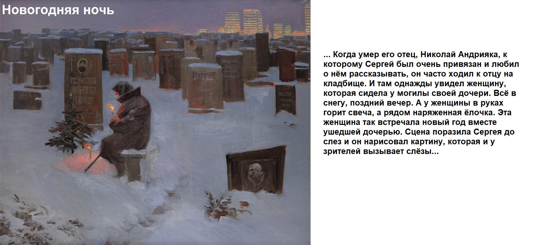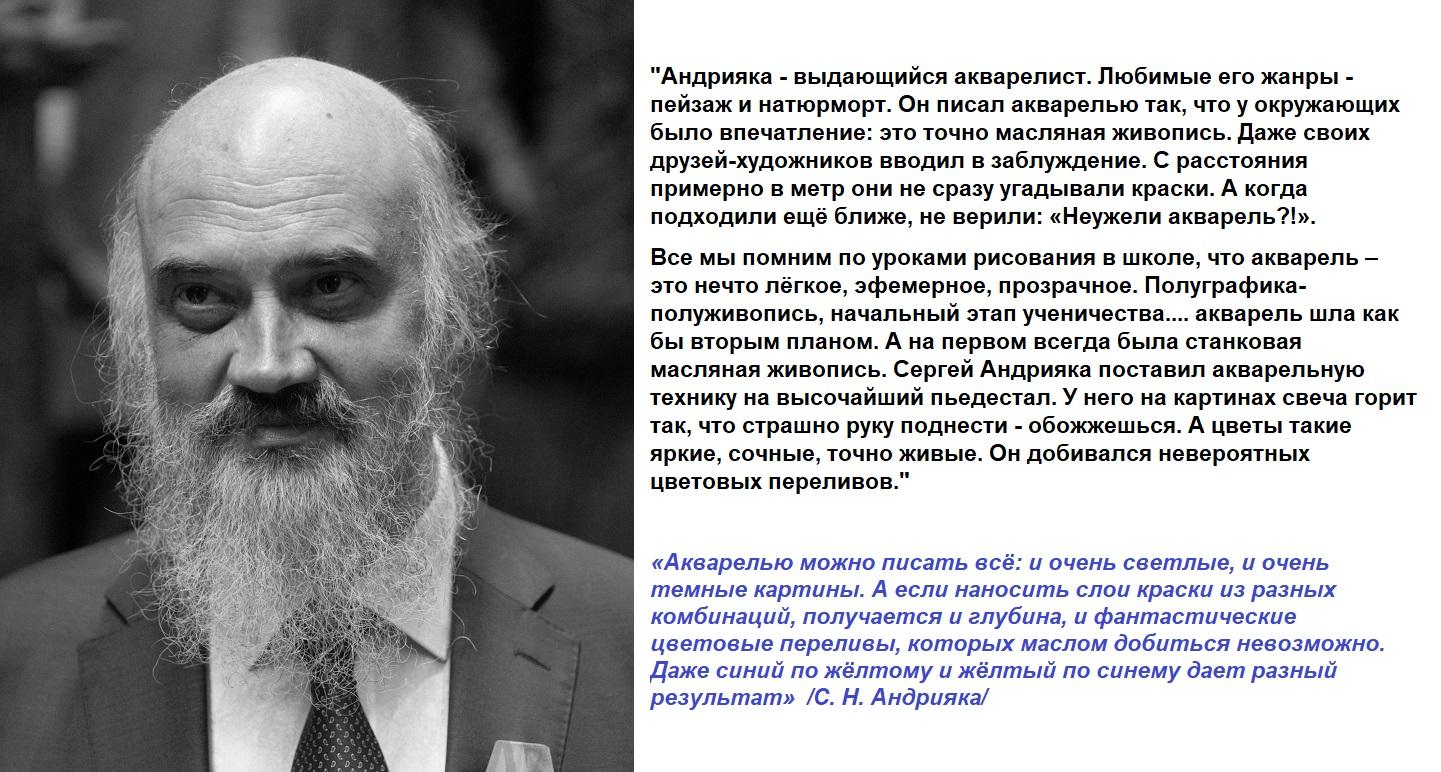 Его отец, заслуженный художник Н. И. Андрияка, был преподавателем и директором в Суриковской ХШ. Лет с шести Сергей выезжал с отцом и его учениками на этюды. Там все рисовали. И он начал. И как все ученики начал с акварели. И не прекращал ею заниматься, когда поступил в Суриковскую школу, хотя в основном там учили писать маслом. Но над ним никто не довлел, не вмешивался, не принуждал: «Главное для художника – это его собственное видение», - говорил Андрияка.Отличный портрет прекрасного художника!
