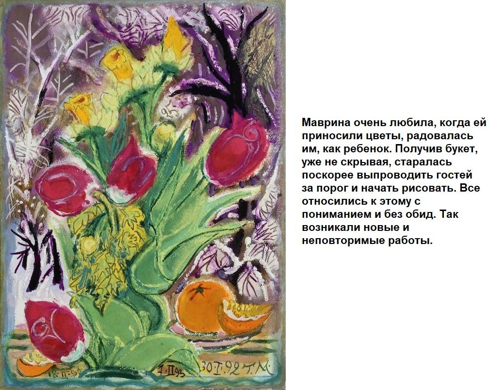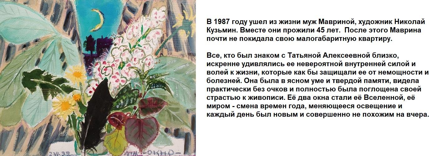 Художница прожила долгую, счастливую жизнь, ни на день не прекращая рисовать. Заниматься живописью для нее - это как дышать, невозможно остановиться.