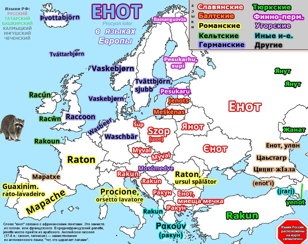 ответитьСложные слова начнёшь переводить буквально - через раз фигня получится. В любом языке такие приколы есть, наверно. Да и еноты не водились нигде, кромее Америки, потому название этому зверю придумывали в Европе кто во что горазд. Капитан Джон Смит якобы слышал, как индейцы называли зверька “ah-rah-koon-em” (тот, кто скребёт руками), но колонисты упростили слово до "raccoon". В русском языке зверька обозвали еще позже. Название заимствовали, вероятно, от названия похожего зверька генеты (семейство виверровые, водятся в Африке, Франции и Испании; см.фото). То бишь содрали с французского genette (или голландского genetta, да и немецкое Genettkarze им созвучно), что, вероятно, восходит к арабскому слову jarnait, имеющему значение «соболиная кошка». Немцы самостоятельно назвали енота "Waschbär", а не переиначили английское "raccoon", как во многих странах.