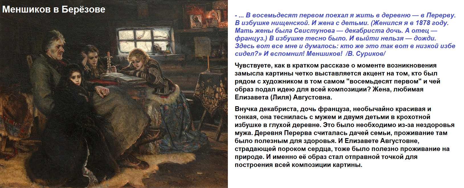 ответитьЕлизавета Августовна Шаре — супруга Василия Ивановича Сурикова. А кто такой В.И.Сури не поняла? Автор напишите хотя бы кто он такой и какие у него картины.
