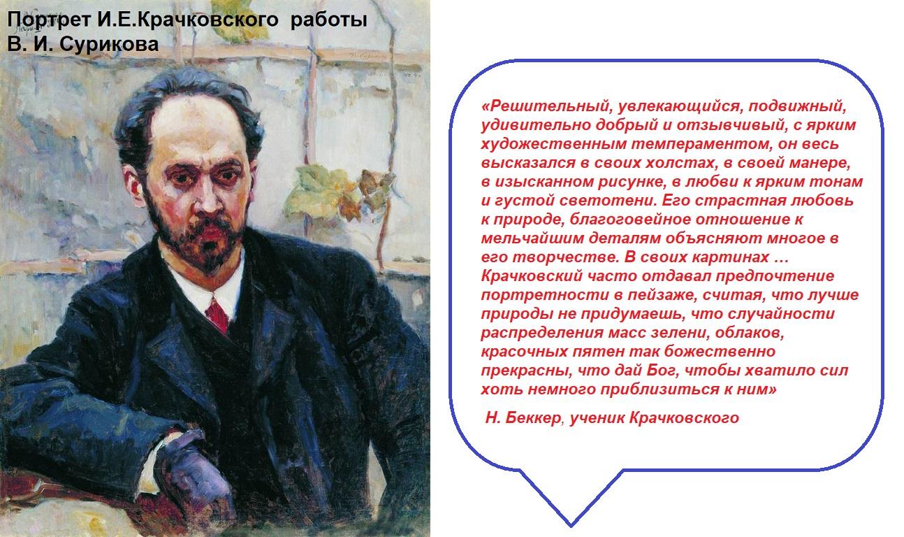 И. Крачковский — русский живописец-пейзажист. С ранних лет проявил интерес к живописи и музыке. Несколько лет учился в Консерватории. Но любовь к живописи оказалась сильней, и с 1871 года Крачковский - вольнослушатель Санкт-Петербургской Академии художеств. В 1880 году был отправлен за границу на четыре года для дальнейшего совершенствования мастерства.Хороший, похожий портрет прекрасного художника. И его пейзажи прекрасны – отдохновение для глаз и души.