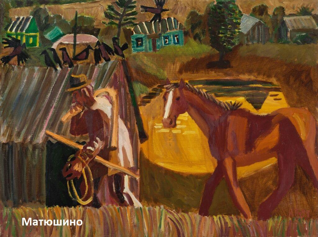 Живописная манера Пчельникова мне совершенно не близка. Но среди его картин встречаются просто удивительные работы, которые воздействуют непосредственно на чувства. В некоторых эмоции просторвутся с полотна, видно , насколько сильно и остро чувствует художник. В то же время, например, серия «Матюшино», посвященная деревне, в которой обосновался Пчельников в последние десятилетия жизни, полна радостью жизни, спокойствием и неспешностью. В общем, получила удовольствие, не только решая кросс, но и знакомясь с творчеством художника.