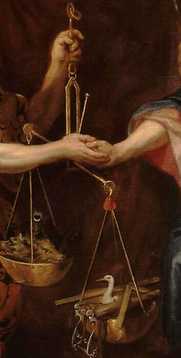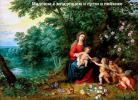Но вот в Эрмитаже есть картна (написанная в сотрудничестве с Брейгелем Младшим) , называется "Аллегория добродетельной жизни". Она интересна тем, что каждый персонаж или предмет что-то символизирует. Например, два человека, взявшиеся за руки - это один человек с его хорошими и плохими качествами. Журавль на правой чаше весов символизирует бдительность и осторожность. И т.д., кому интересно, найдите информацию в инете). А ниже - портрет художника, и та самая картина с некоторыми ее символами, о которых я написала выше.