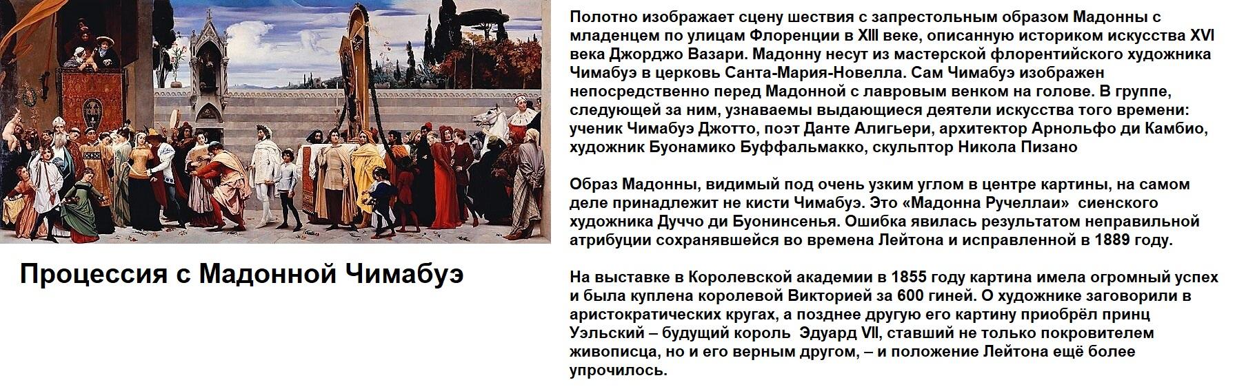 Первая картина, принесшая ему настоящую известность, была «Мадонна Чимабуэ» (см. фото 1). И уже в начале 1860-х ежегодный доход Лейтона составлял 4000 £. Затем членство в Королевской академии художеств, роскошный особняк с мастерской, избрание президентом Королевской Академии и награждение орденом Почётного легиона. В том же 1878 году Лейтон был посвящён в рыцари и получил титул баронета.