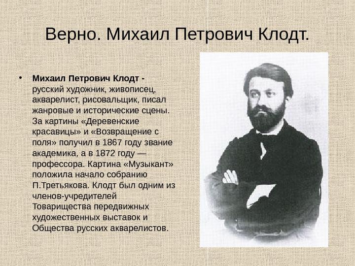 ответитьНо на нем изображен не Михаил Константинович Клодт, племянник знаменитого ваятеля барона Петра Клодта, а Михаил Петрович Клодт, старший сын скульптора, и тоже художник. Вот такой компот!)))